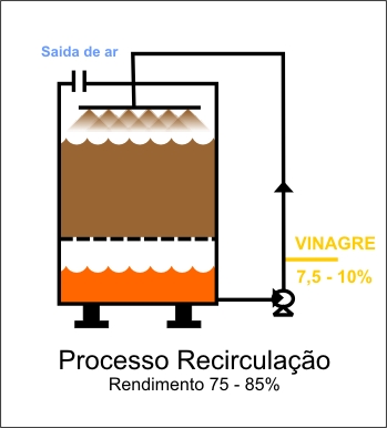 A fermentação rápida (recirculação) é efetuada com recheio de carvão vegetal ou bambú seco, como aumento da superficie de transferência de oxigênio, aumentando também a quantidade de bactérias acéticas. |