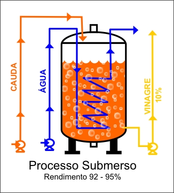 A fermentação submersa é efetuada com uma injeção de ar em meio hidroalcoólico na forma de micro bolhas, possibilitando a dissolução do oxigênio do ar com a mistura. |